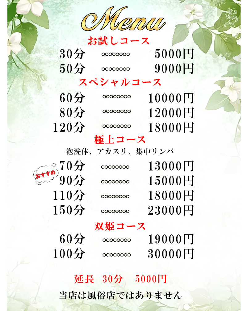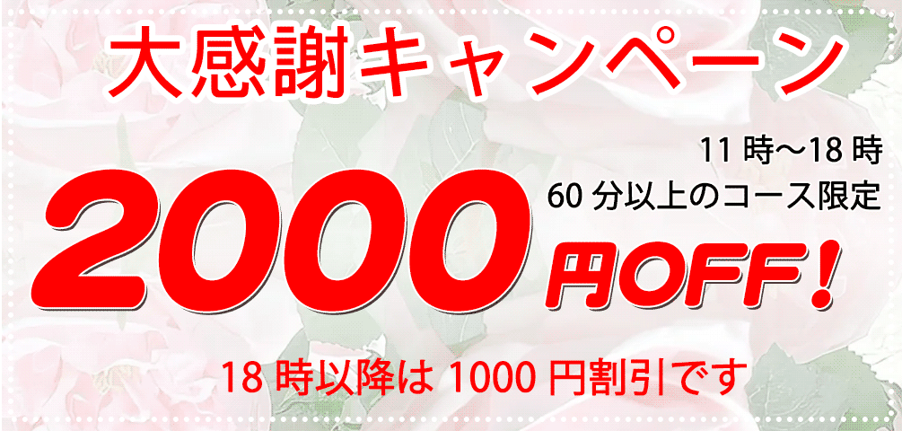 当店では、アロマオイルの効能と当店自慢のセラピストによるリンパマッサージの相乗効果による、癒しのひとときをお客様お一人お一人にお届けしております、自然で心やすらぐ優美な香りを、施術中はもちろんご帰宅お休みになってから翌日朝目覚めでまで楽しんで頂けます、どうぞゆっくりご堪能ください。